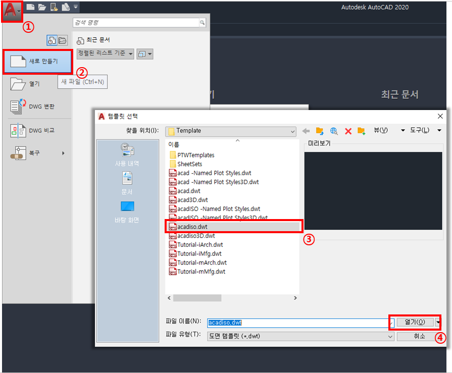 왼쪽 상단에 A 아이콘 클릭 -> 새로 만들기 -> 템플릿 선택 창에서 acadiso.dwt 선택 후 열기