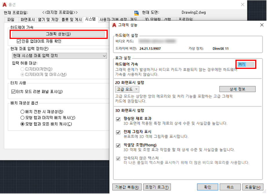 그래픽 성능의 하드웨어 가속이 끄기로 되어있는 경우 일부도 도면에서 프로그램 성능이 저하되거나
