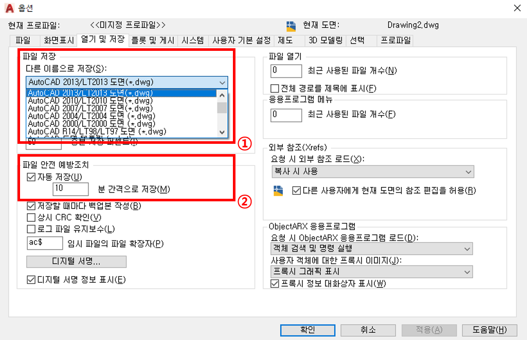 ① - 파일 저장 항목에서는 도면을 저장했을 때 저장되는 버전을 설정할 수 있습니다.