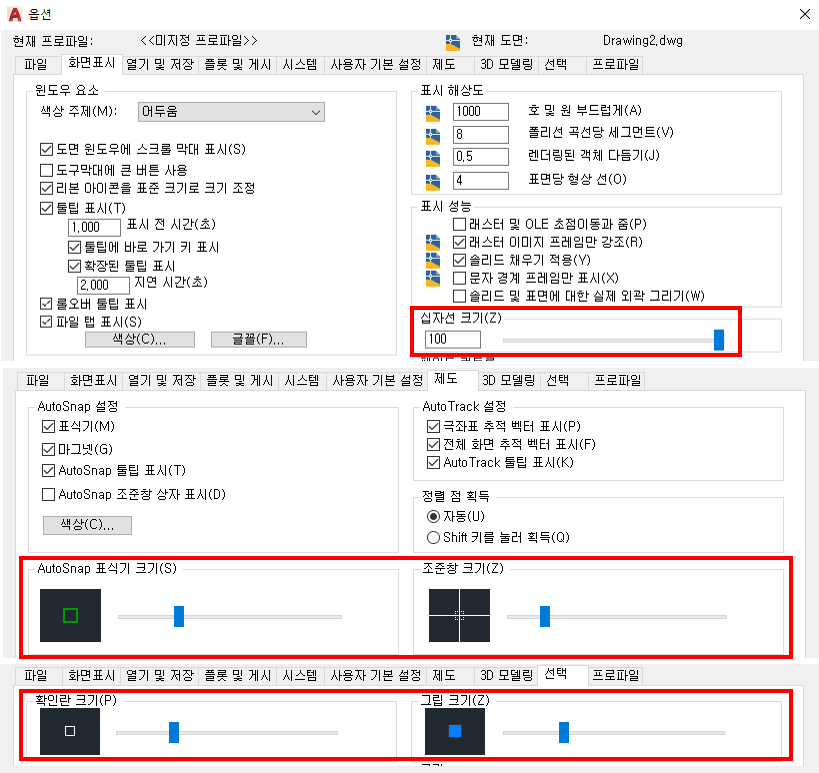 이 밖에 화면 표시 탭의 십자선 크기-100, 제도 탭의 표식기, 조준창 크기, 선택 탭의 확인란, 그립 크기 등은 사용자의 취향에 따라 프로그램을 사용해 보면서 수정하면 됩니다.